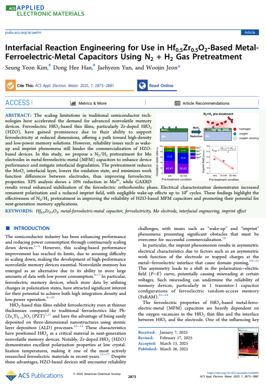 Interfacial Reaction Engineering for Use in Hf0.5Zr0.5O2‑Based Metal-Ferroelectric-Metal Capacitors Using N2 + H2 Gas Pretreatment, 2025, ACS Applied Electronic Materials, https://doi.org/10.1021/acsaelm.5c00045