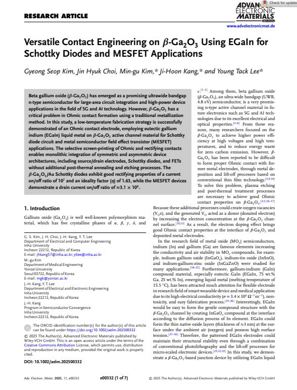 Versatile Contact Engineering on 𝜷 -Ga2O3 Using EGaIn for Schottky Diodes and MESFET Applications, 2025, wiley advanced, https://doi.org/10.1002/aelm.202500332