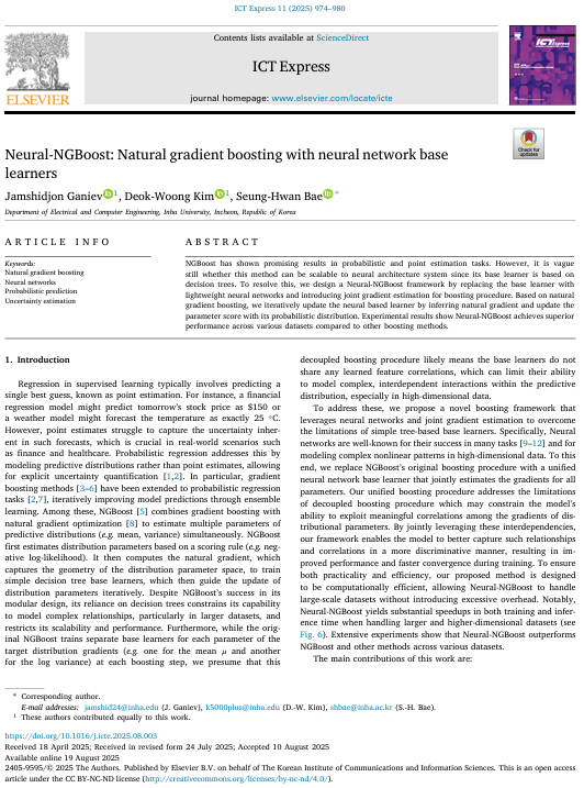 Neural-NGBoost: Natural gradient boosting with neural network base learners, 2025, Korean Institute of Communications and Information Sciences, https://doi.org/10.1016/j.icte.2025.08.003