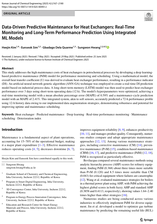 Data-Driven Predictive Maintenance for Heat Exchangers: Real-Time Monitoring and Long-Term Performance Prediction Using Integrated ML Models, 2025, Springer, http://doi.org/10.1007/s11814-025-00493-2